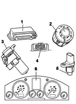Fig.3.88.Electrical / electronic components and fitting locations on the transfer case: 1 - control the transfer case;2 - management body transfer case;3 - motor transfer case;4 - diagnostic connector;5 - the switch of idling;6 - multi-function display in the instrument cluster
